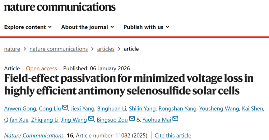 近日,av影片直播邹炳锁教授领衔的纳米光子学材料与技术团队在硒硫化锑(Sb2(S,Se)3)太阳电池领域取得新进展,相关成果以“Field-effect passivation for minimized voltage loss in highly efficient antimony selenosulfide solar cells”为题,发表在国际顶级期刊自然通讯 (Nature Communicatios)。资环材学院2025级博士研究生龚安稳为第一作者,邹炳锁教授、刘聪助理教授、暨南大学麦耀华教授和广东工业大学王晶副教授为共同通讯作者,av影片直播