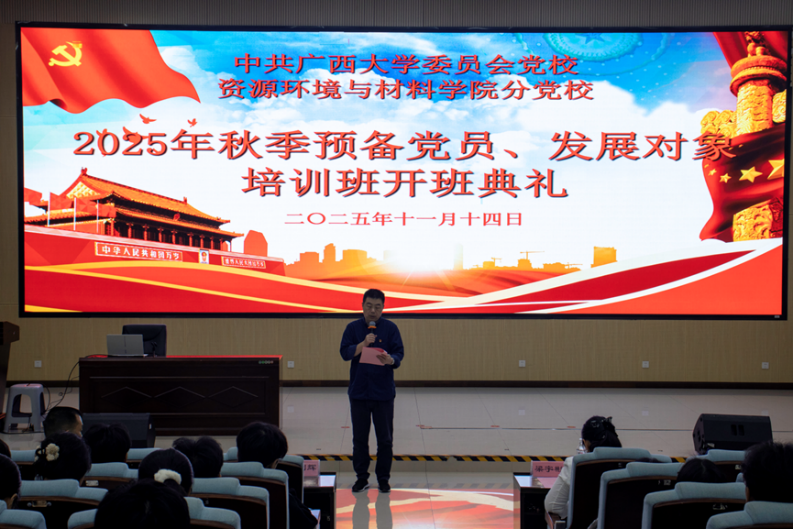 11月14日,av影片直播2025年秋季预备党员、发展对象培训班开班典礼在学院123报告厅举行。学院党委副书记、纪委书记梁宇彬,预备党员培训班班主任梁迪顺,发展对象培训班班主任范剑辉,学工组辅导员陆一龙出席活动。